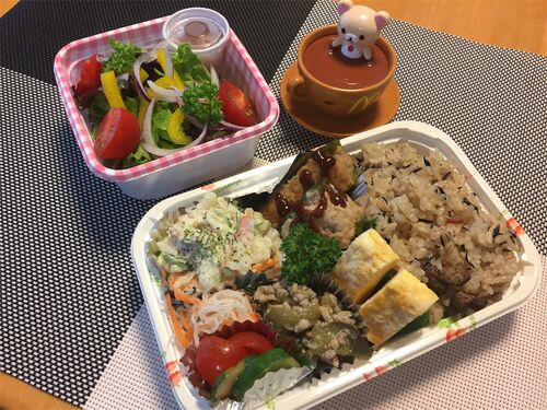⭐︎ひじき御飯 ⭐︎肉詰めピーマン ⭐︎卵焼き ⭐︎ナスのそぼろ煮 ⭐︎ポテトサラダ ⭐︎大根なます ⭐︎キュウリとプチトマトの塩昆布和え ⭐︎野菜サラダ
