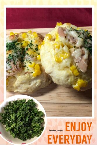 ⭐️ツナとコーンの簡単パン ホットケーキミックスを使って簡単に作りました。戴いた甘いトウモロコシをたっぷり乗せてみました。 プランターで育てたパセリはチンして乾燥パセリにして保存。 売り物よりも匂いと味が凄い✨