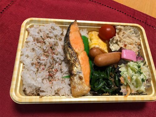 ⭐️シャケの塩焼き ⭐️卵焼き ⭐️卯の花 ⭐️ポテトサラダ ⭐️ほうれん草のお浸し ⭐️ウィンナー ⭐️かまぼこ ⭐️プチトマト