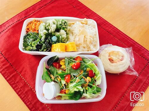 ⭐️筍ごはん ⭐️ふきのとうの天ぷら ⭐️出汁巻玉子 ⭐️菜の花のごまマヨネーズ和え ⭐️人参の明太子炒め ⭐️きゅうりとわかめの酢物 ⭐️野菜サラダ ⭐️ハムチーズパン