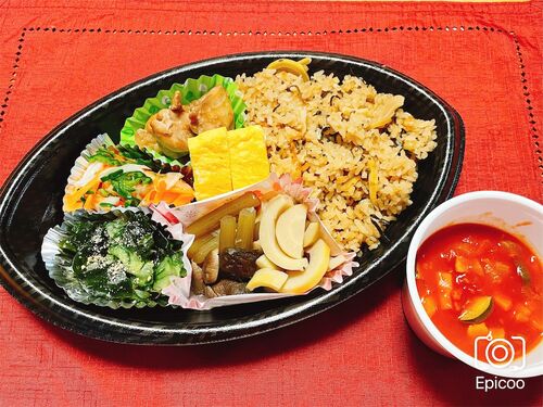 ⭐️筍ごはん ⭐️出汁巻玉子 ⭐️シャケ南蛮漬け ⭐️チキン照り焼き ⭐️きゅうりとワカメの酢物 ⭐️筍とフキの煮物 ⭐️野菜トマトスープ